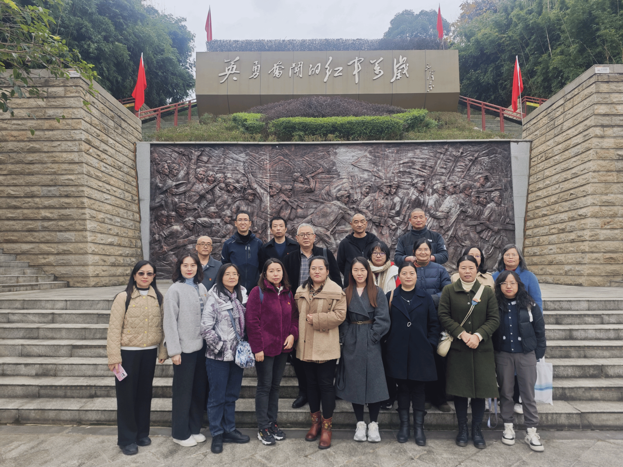 档案馆雅安校区、图书二馆党小组赴红军百丈关战役烈士纪念园追忆峥嵘岁月,前往平乐古镇开展工会活动,在讲解员的引导下,大家详细聆听百丈关战役的峥嵘岁月,了解百丈关战役为红军三大主力胜利会师和长征胜利做出的重要贡献,在红色足迹中深刻感悟革命先辈为理想信念浴血奋战的崇高精神。