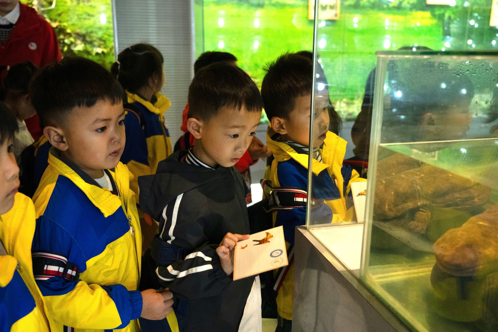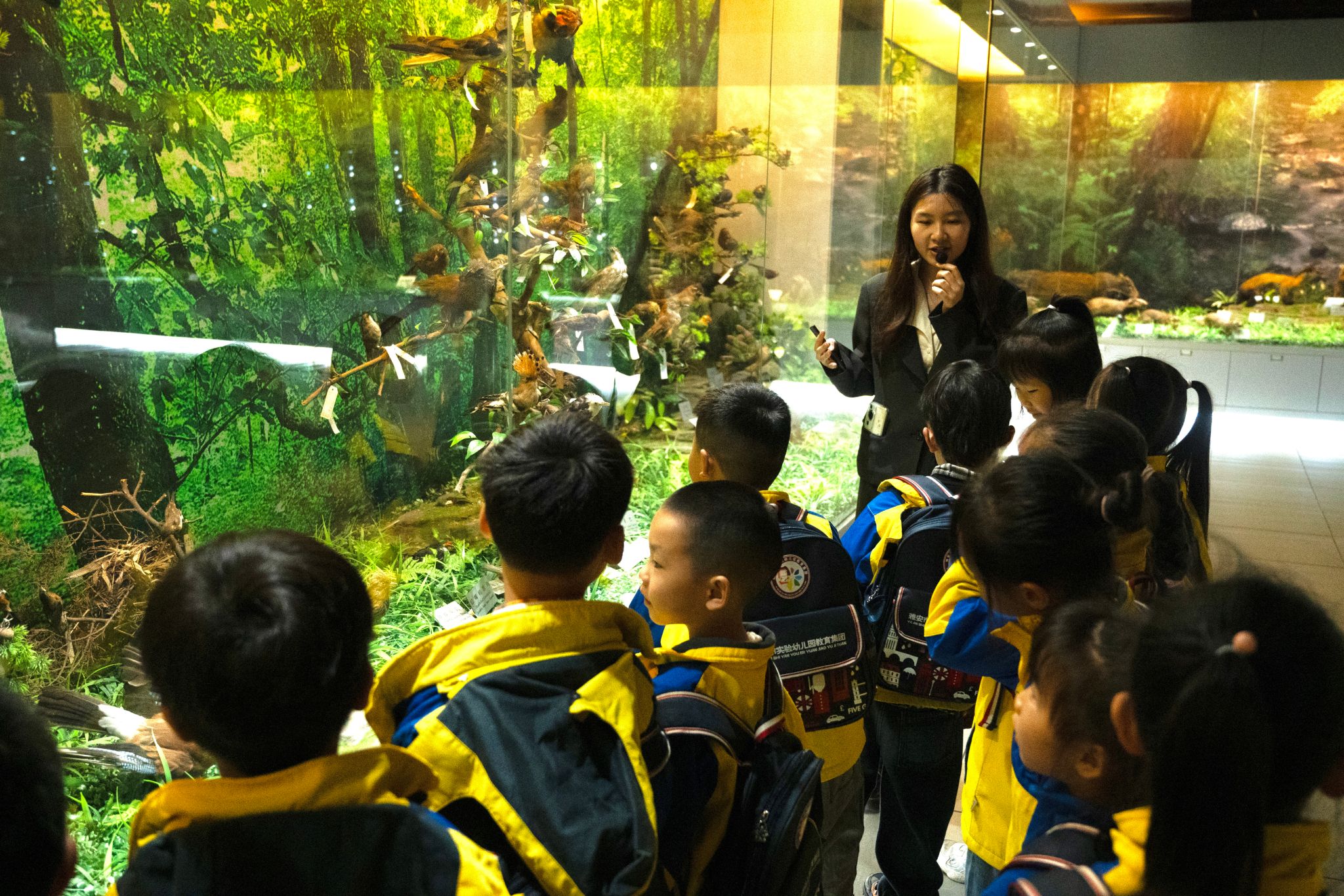 上午,来自雅兴幼教集团5所幼儿园的500名幼儿在教师及志愿者的引导下,分批次有序进入动物标本馆进行参观学习。馆内陈列的各类珍稀动物标本栩栩如生,从威风凛凛的金钱豹到灵动秀美的金丝猴,从色彩绚丽的绿尾虹雉到品类繁多的鸟类世界,每一件标本都吸引着孩子们好奇的目光。在参观过程中,专业讲解员以通俗易懂的语言,结合标本实物,向幼儿介绍了不同珍稀动物的形态特征、栖息环境及当前面临的生存挑战。孩子们时而凝神聆听,时而踊跃提问,现场气氛热烈而温馨。