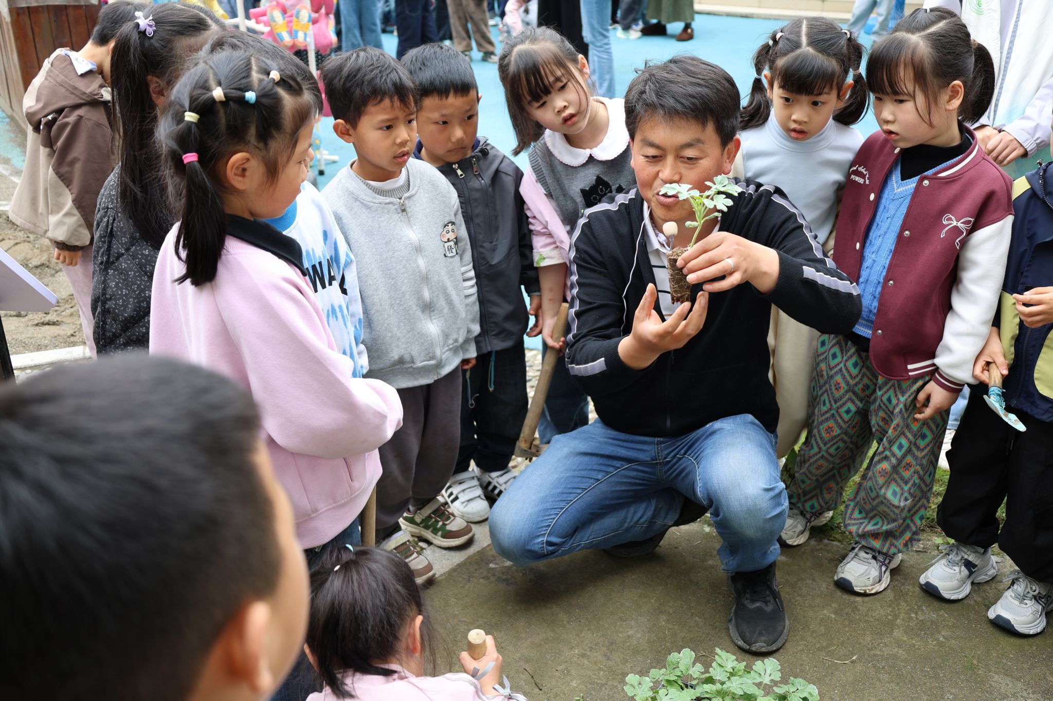 在幼儿园农耕实践区,由动物标本馆牵头共建了“童耕西瓜科普实践园”,我校生命科学学院陈涛副教授担任技术指导。陈涛为实践园提供了优质西瓜种苗,结合植物生长发育规律、西瓜育种与园艺栽培基础理论,将专业农学知识转化为幼儿易懂的科普内容,为孩子们生动讲解种植科普小知识,并带领幼儿开展现场种植体验活动。