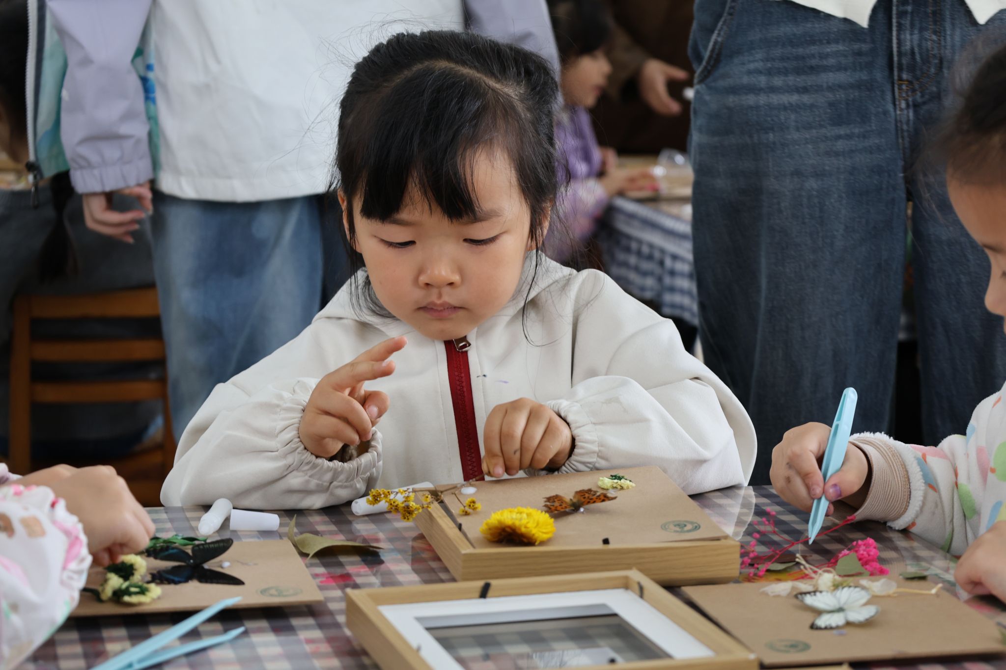 活动兼具科普专业性与童真趣味性,在“自然科普小课堂”环节,动物标本馆蜀韵科绿志愿者团队为幼儿带来了丰富多样的自然科普体验。科普讲解员依托馆藏资源,采用实物标本展示、通俗化讲解与互动问答相结合的方式,耐心介绍生物多样性与生态保护的基础知识,并引导幼儿亲手参与蝴蝶标本装订和植物标本贴画制作。